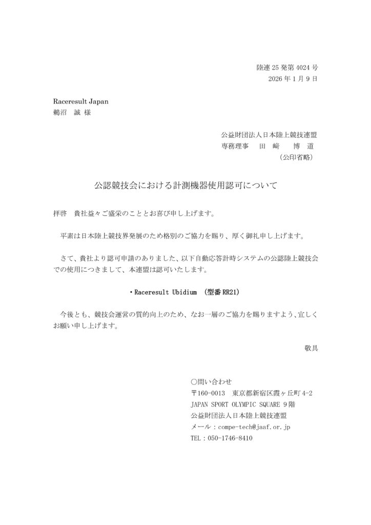JAAF日本陸上競技連盟 の公認機材として認定を受けました。